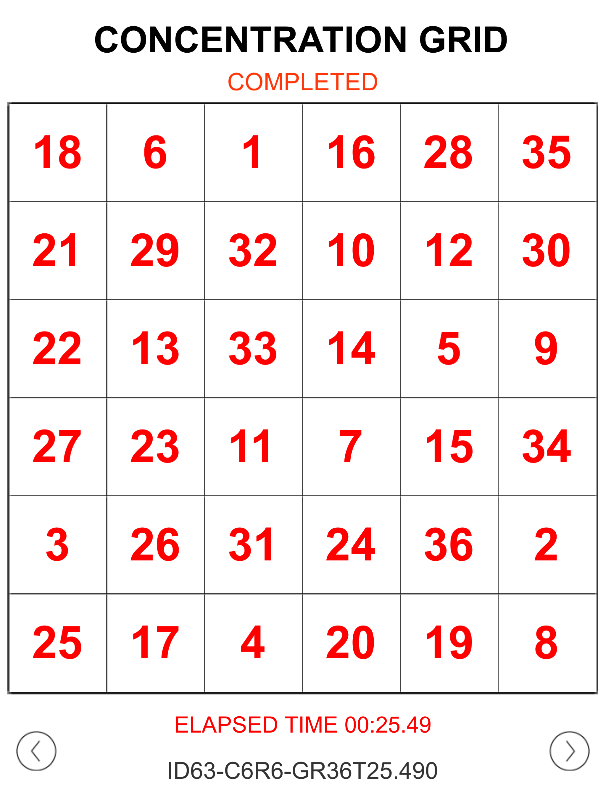 Concentration Grid – 6×6 grid time of 25.49 seconds