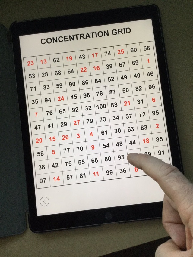 • Challenge/practice your power of focus/concentration with grids from 3 to 14 rows/columns … complete a 3×3 grid in under 5 seconds, a 4×4 grid in under 10 seconds, a 5×5 grid in under 15 seconds, a 6×6 grid in under 30 seconds, a 7×7 grid in under 1 minute, an 8×8 grid in under 2 minutes, a 9×9 grid in under 3 minutes, a 10×10 grid in under 4 minutes